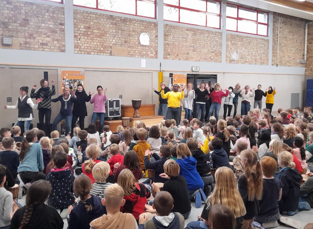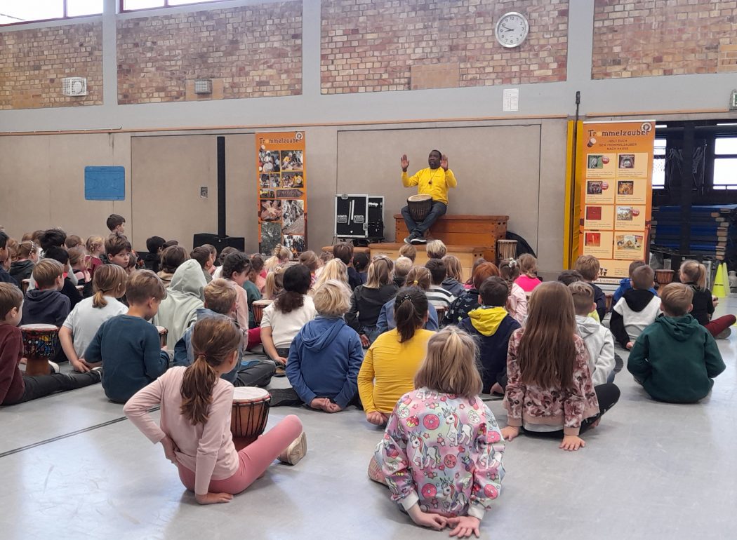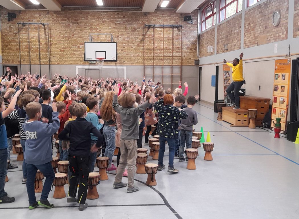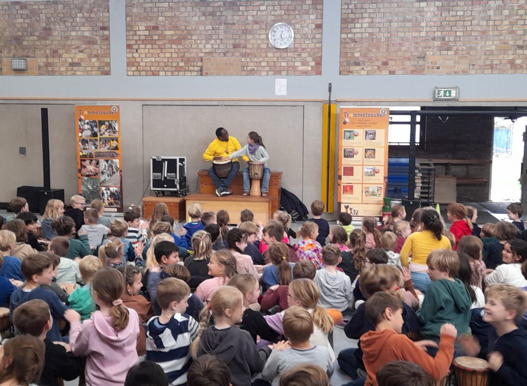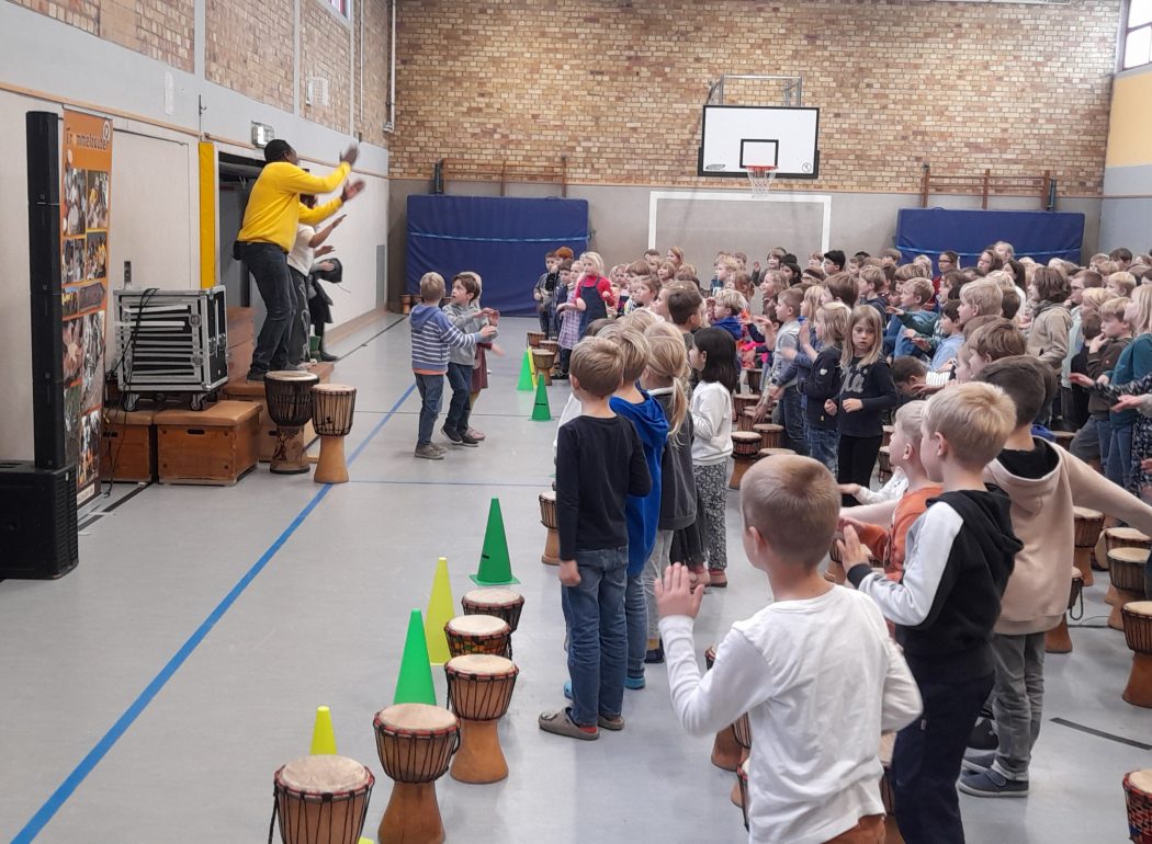 Am Montag, den 06.11.2023 hatten wir einen Trommelzauber-Aktionstag bei uns in der Turnhalle. Die Kinder reisten mit Fofo mit einem Zauberflugzeug in das Trommelzauber-Dorf Tamborena und erlebten dort einen Trommel-Vormittag voller Rhythmen, Tänzen und Liedern!