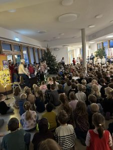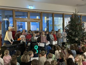 Zum gemeinsamen Adventssingen versammelten sich alle Jahrgänge der Petri-Grundschule in der Eingangshalle. Vorne präsentierte der Schulchor, begleitet von den Musiklehrerinnen, die in den vergangenen Wochen eingeübten Advents- und Weihnachtslieder. Die übrigen Kinder aller Klassen saßen gespannt davor, stimmten begeistert mit ein und lauschten den musikalischen Beiträgen ihrer Mitschülerinnen und Mitschüler. In der festlichen Atmosphäre mit Lichtern und Weihnachtsbaum wurde das Adventssingen zu einem bewegenden Moment der Gemeinschaft und Einstimmung auf die Weihnachtszeit.